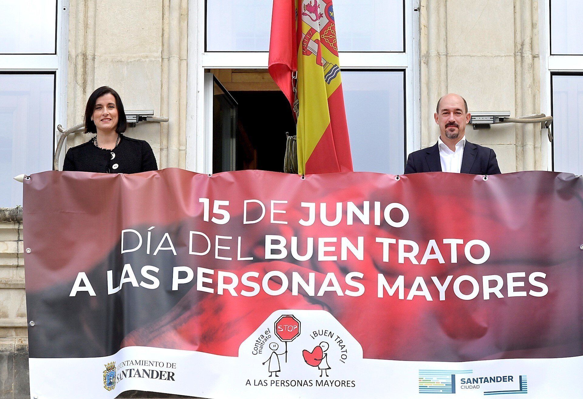 La fachada del Ayuntamiento de Santander luce desde primera hora de esta mañana una pancarta conmemorativa por el Día del Buen Trato a los Mayores, que pretende sensibilizar a los vecinos y promover el buen trato hacia los santanderinos mayores.