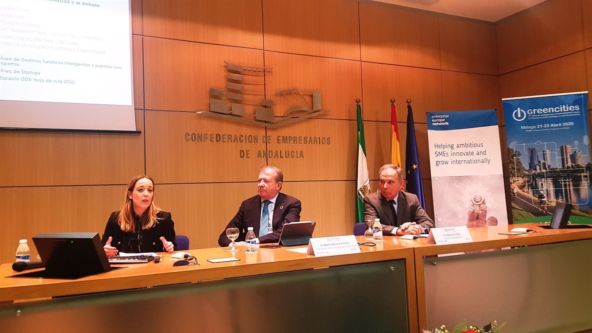 El presidente de la Comisión de Agenda Digital de la Confederación de Empresarios de Andalucía, Adolfo Borrero, y el director de Greencities, Foro de Inteligencia y Sostenibilidad Urbana, Rafael de la Paz, han presentado este miércoles los contenidos de esta edición, que se celebrará en FYCMA Palacio de Ferias y Congresos de Málaga.