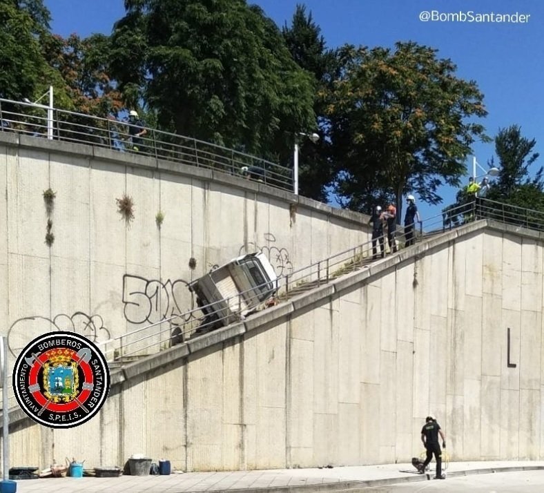 Los bomberos de Santander han retirado este lunes un vehículo del servicio de Parques y Jardines que se había precipitado por unas escaleras en la calle Ernest Lluch.