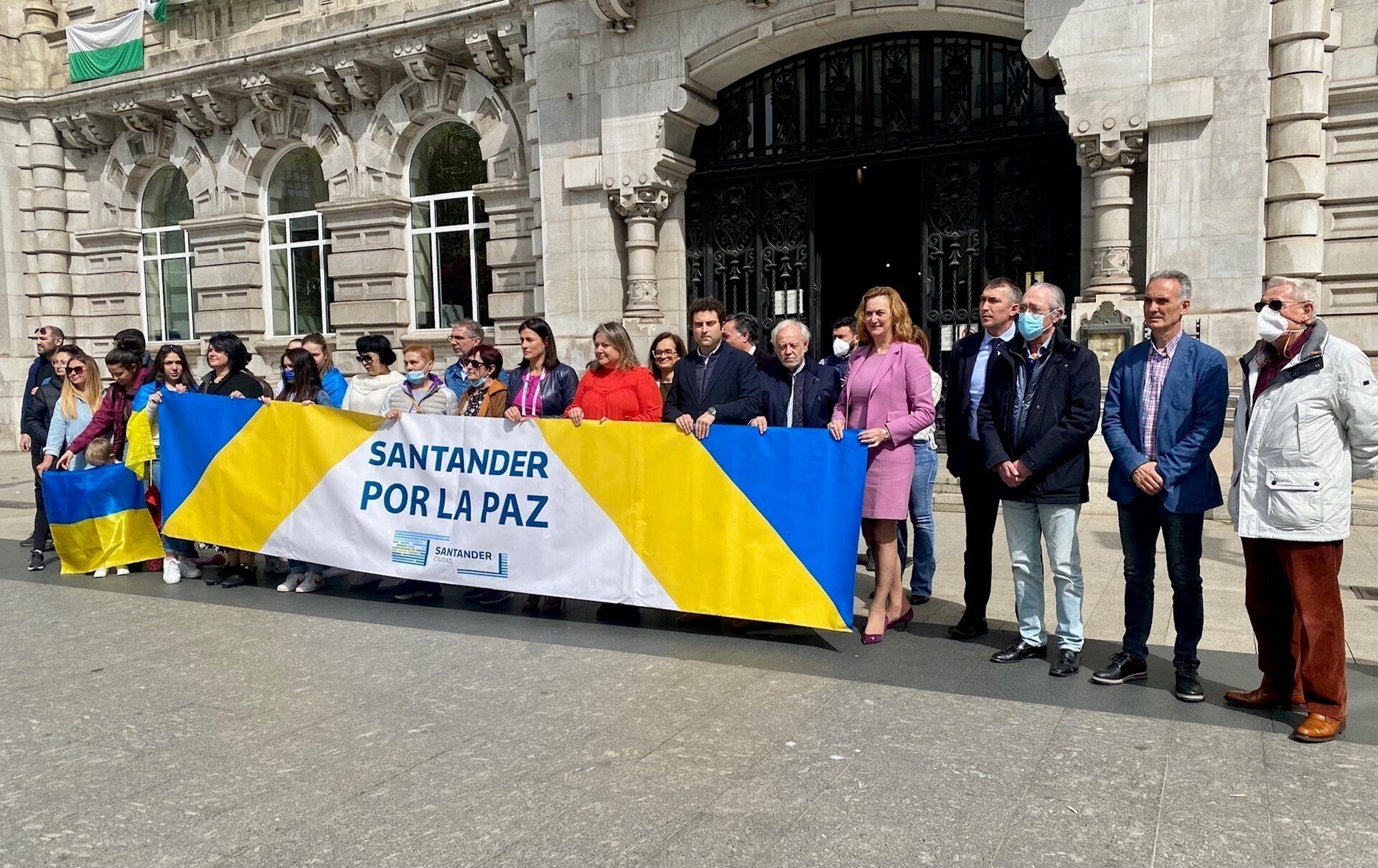 La Plaza del Ayuntamiento de Santander ha vuelto a acoger este viernes un acto en el que se ha guardado un minuto de silencio para condenar la guerra en Ucrania y trasladar el apoyo de la ciudad a los ciudadanos ucranianos.
