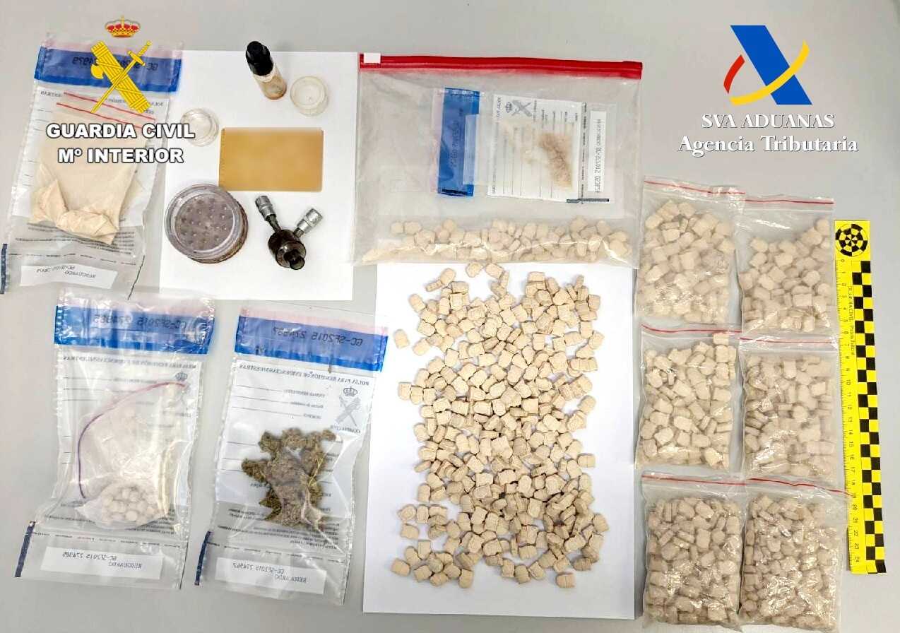 En un registro más exhaustivo de los tres vehículos, encontraron en el buggi dos cajas de cartón con 920 pastillas que resultaron ser de MDMA (sustancia psicotrópica derivada de las anfetaminas con efectos tanto alucinógenos como estimulantes, más conocido como éxtasis) y otras cantidades de hachís, metanfetamina y marihuana.