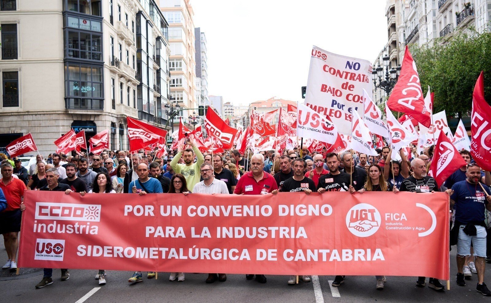 Los trabajadores del sector del metal se han manifestado esta tarde en Santander en la primera jornada de huelga indefinida convocada por los sindicatos UGT, CCOO y USP para reclamar un convenio "digno" y la subida de los salarios.