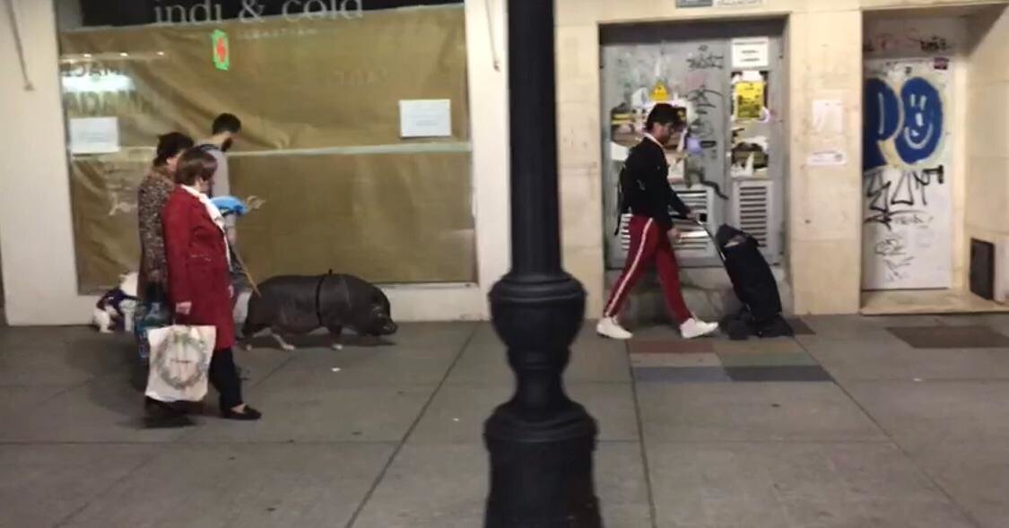 Muchos han sido los viandantes que esta tarde se han sorprendido al ver a un joven paseando junto al Ayuntamiento de Santander con un ejemplar de cerdo vietnamita de relativas grandes dimensiones.