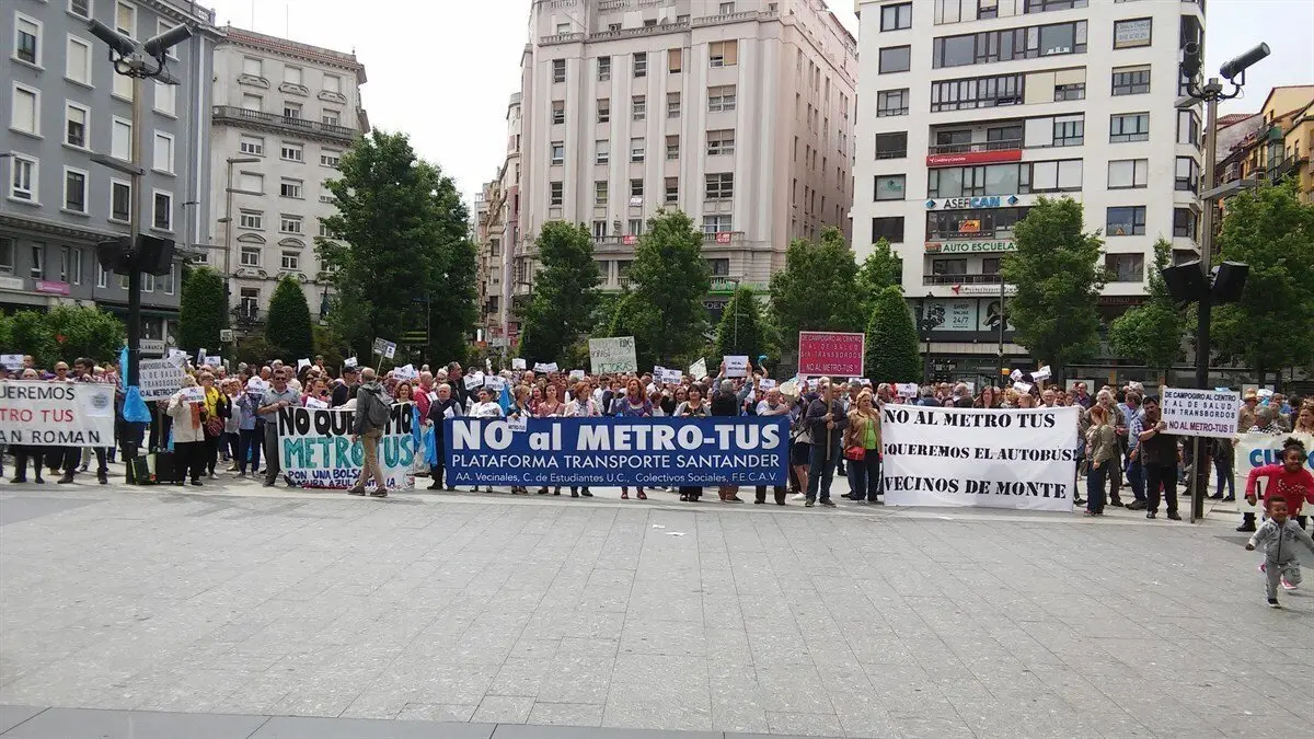 Convocados por la Plataforma Transporte Santander, los participantes en la concentración, la tercera que se celebra, se han situado detrás de grandes pancartas con el lema común de 'No al Metro-Tus', y han coreado consignas acompañadas de pitadas.