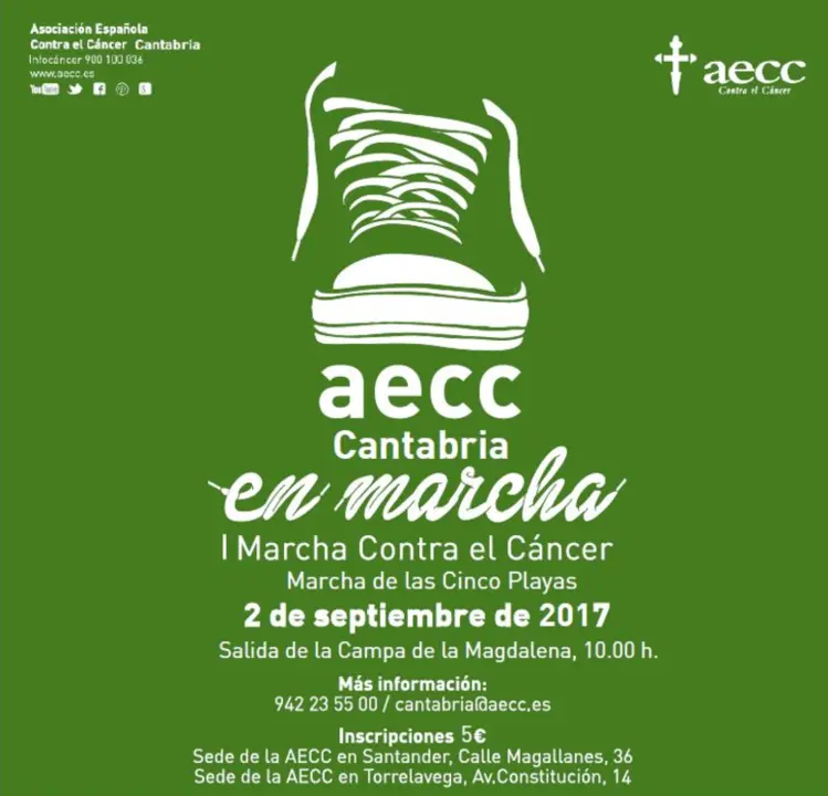 Los dorsales para la Marcha del día 2, que tendrán un precio de cinco euros, pueden adquirirse en la sede de la AECC en Santander (calle Magallanes, 36); en Torrelavega (Avenida de la Constitución, 40), departamento de deportes del centro comercial El Corte Inglés; o en los centros deportivos Body Factory Mataleñas (calle Autonomía, 2); GoFit (Rosalía de Castro, 2), y Metropolitan (calle Cisneros 65-67).