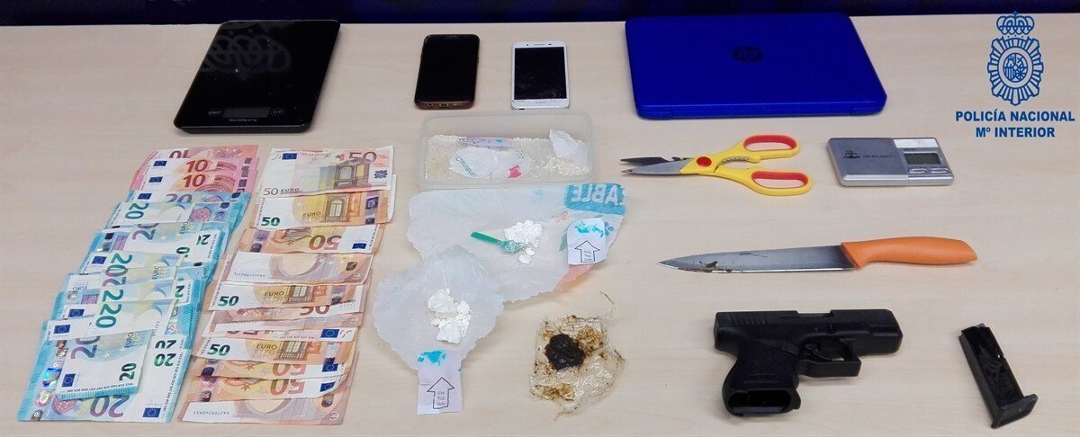 En el interior, se intervino una pistola con cargador, cocaína, un envoltorio con resina de hachís, un ordenador, 1.500 euros en billetes de 50, 20 y 10 euros, así como numerosos útiles y efectos relacionados con esta actividad.