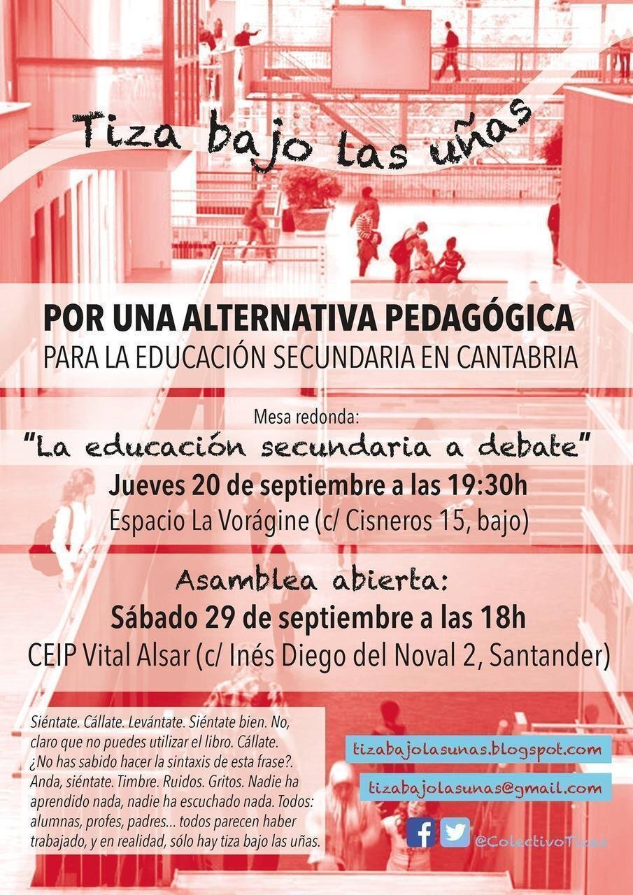 Creado hace unos meses y formado por vecinos, padres, profesores y algunos estudiantes, el colectivo 'Tiza bajo las uñas' defiende una alternativa pedagógica para la educación Secundaria en Cantabria, y se define como "un grupo inquieto de cántabros que no nos conformamos con el sistema educativo actual y queremos algo diferente para Secundaria".