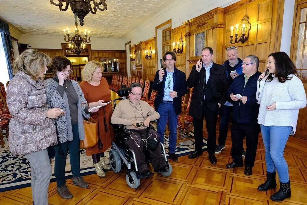 El concejal de Autonomía Personal, Roberto del Pozo, ha comprobado el funcionamiento de las audiosignoguías junto a la responsable de Cultura y Turismo, Miriam Díaz; la presidenta de FESCAN, Cristina Brandariz; el presidente del Consejo Territorial de la ONCE, Gustavo Seco; el presidente de la Asociación de Implantados Cocleares de Cantabria, Antonio Simón; y el vicepresidente y el secretario de la Asociación de Personas Sordas de Santander y Cantabria, Ángel Puente y Amado González.