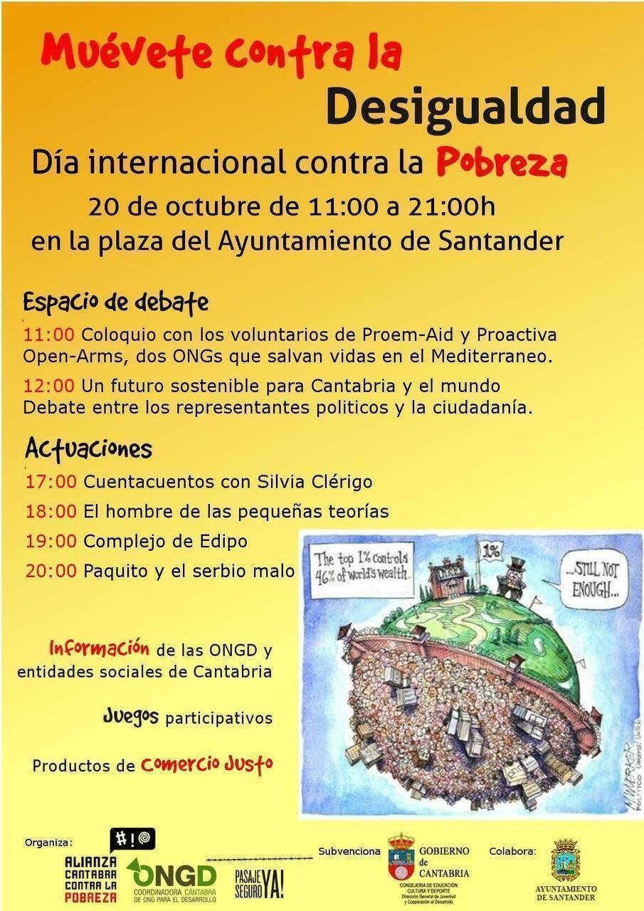 La Alianza Cántabra contra la Pobreza, que engloba a más de 50 entidades, ha organizado para este sábado, 20 de octubre, un debate público en la Plaza del Ayuntamiento de Santander con organizaciones sociales, partidos políticos con representación parlamentaria y ciudadanos.