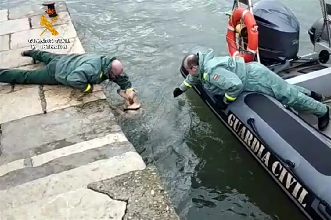 Sobre las 9.15 la propietaria de la perra pidió auxilio para su perra, desplazándose al lugar efectivos del Servicio Marítimo de la Guardia Civil, tanto por mar, con una embarcación neumática, como por tierra.