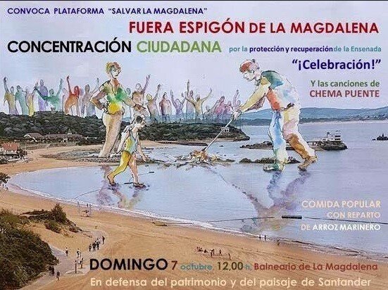La concentración será, a partir de las 12.00 horas, en el Balneario de la playa de la Magdalena, en Santander, en las inmediaciones de las obras, y, como celebración, habrá una comida popular con reparto de arroz marinero y canciones del compositor cántabro Chema Puente, que precisamente creó un tema contra la obra de los diques.