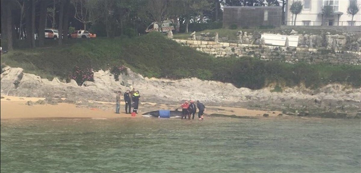 Una ballena de unos cinco metros de longitud ha aparecido varada esta tarde en la playa de Bikinis en Santander y ha sido liberada al mar por efectivos del Servicio Marítimo de la Guardia Civil y de Cruz Roja.
