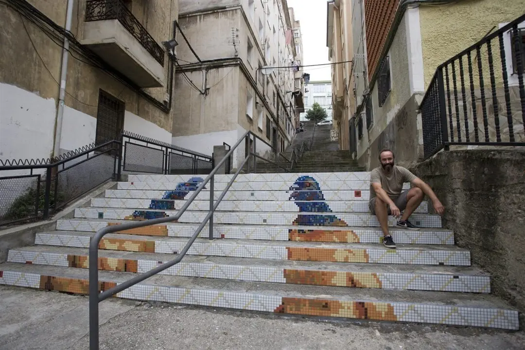 El diseño, creado con 27 colores de mosaico de vidrio ecológico en formato cuadrado, ha sido colocado en las contrahuellas de la escalera.