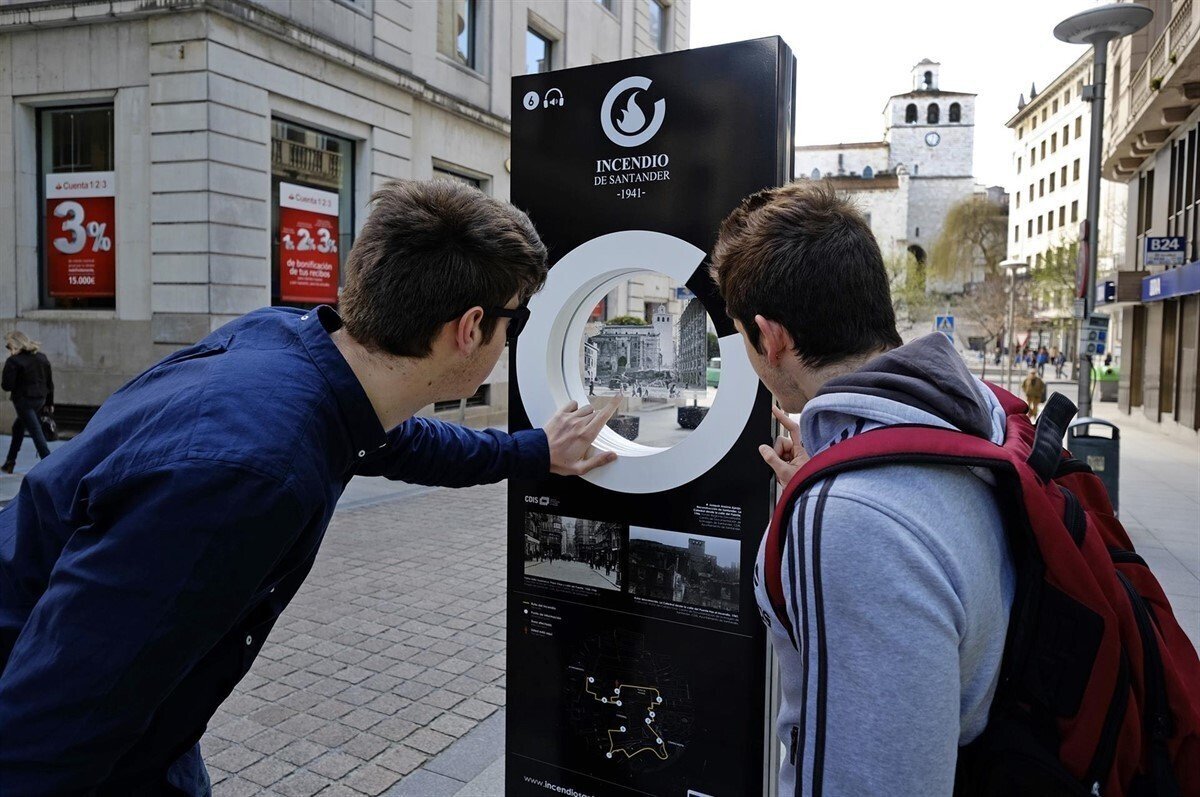 Formada por diez tótems ilustrativos que muestran fotografías antiguas superpuestas a la realidad, la Ruta del Incendio ofrece la experiencia de viajar entre el presente y el pasado de Santander, ayudando a contextualizar el incendio en diez puntos concretos de la ciudad que coinciden con algunos de los lugares más emblemáticos que el fuego asoló.