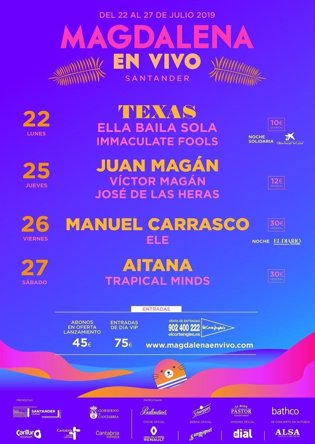 El festival Magdalena en Vivo, que celebrará su primera edición en la capital de Cantabria entre el 22 y el 27 de julio, coincidiendo con las fiestas de la Semana Grande de Santander, tendrá como cabezas de cartel a grupos y artistas nacionales e internacionales como Manuel Carrasco, Texas, Aitana o Juan Magán.