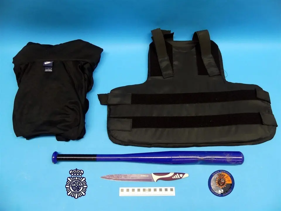 Durante la detención, se les intervino un bate de béisbol, una navaja de 20 centímetros de hoja, así como un chaleco antibalas.