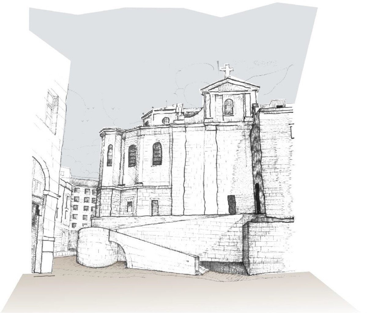 Entre la rampa y el contrafuerte se genera además un espacio prácticamente rectangular, cubierto en su parte este, que podría destinarse a mostrar hallazgos arqueológicos del origen de la ciudad.
