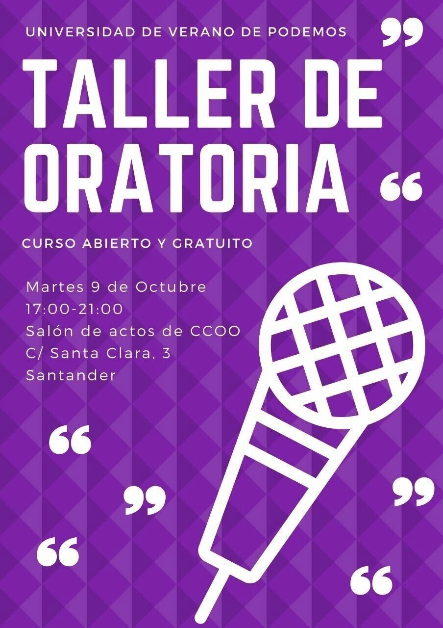 Podemos Cantabria ha organizado para el próximo martes, 9 de octubre, a partir de las 17.00 horas, un taller de oratoria gratuito de unas cuatro horas abierto a toda la ciudadanía.