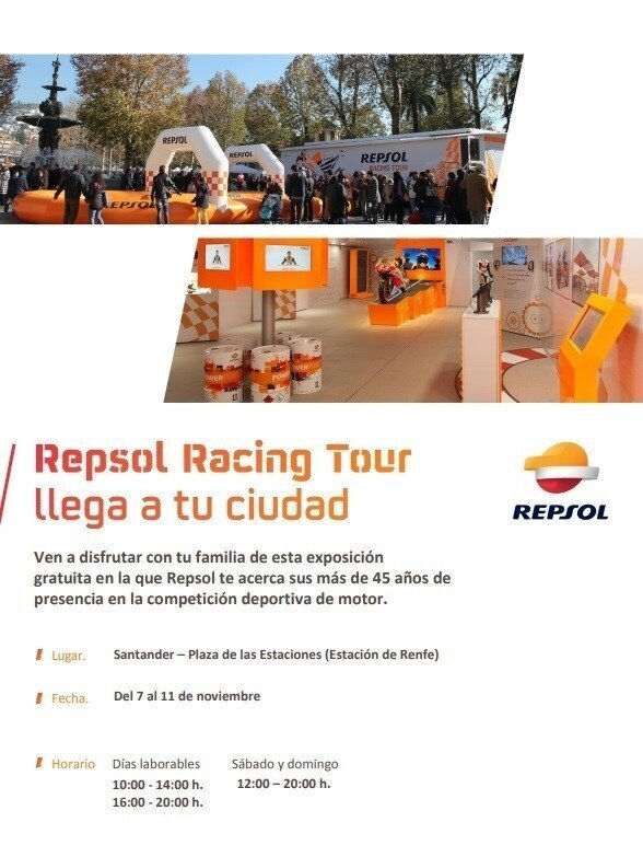 Los ciudadanos podrán disfrutar de forma gratuita de esta exposición, en la que conocerán de cerca al Equipo Repsol en las distintas disciplinas en las que participa o ha participado a lo largo de la historia: Mundial de Motociclismo, Dakar, trial, automovilismo, vuelo acrobático... Además, en Repsol Racing Tour se muestra el apoyo de Repsol al deporte base, a los jóvenes que empiezan a competir, y el compromiso con las causas sociales.