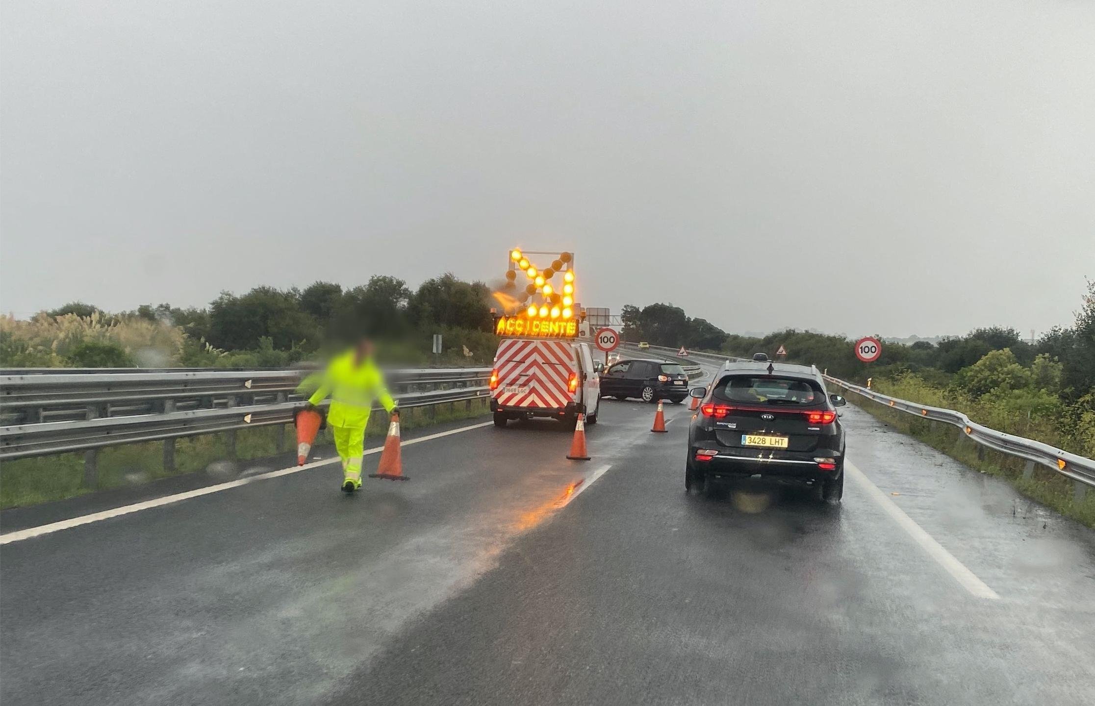 El suceso no reviste gravedad pero el vehículo siniestrado, debido a la intensa tormenta caída, se ha quedado en el carril izquierdo de la vía empotrado contra las barreras de protección.