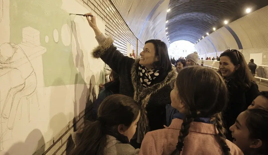 La alcaldesa de Santander, Gema Igual, ha acompañado esta mañana a un grupo de unos 400 escolares santanderinos que han intervenido los 74 paneles del túnel, con pinturas relacionadas con la literatura y especialmente con la obra cumbre del castellano, ‘El Quijote’.