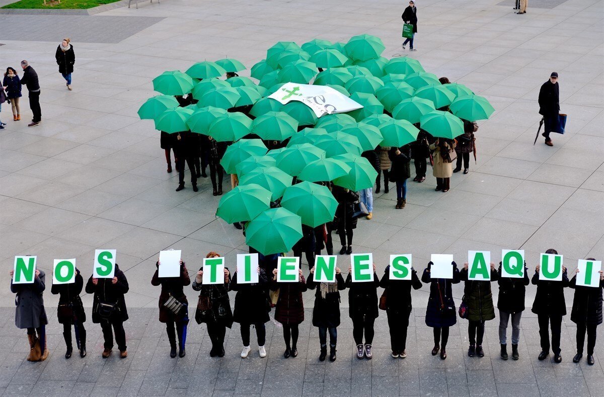 Miembros de la Corporación municipal, representantes de la Asociación Española contra el Cáncer (AECC) en Cantabria y vecinos han participado en este gesto simbólico y se han agrupado para dibujar esa gota verde que representa el icono de ubicación y un mensaje a quienes sufren esta enfermedad para que sepan que cuentan con el apoyo de otras muchas personas y del conjunto de la sociedad.