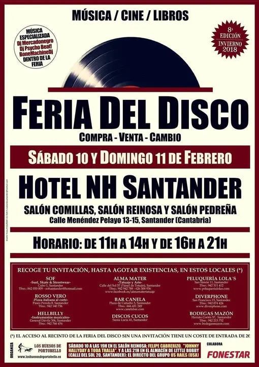 La Feria del Disco de invierno celebra su octava edición este fin de semana, días 10 y 11 de febrero, en el Hotel NH Santander, donde coleccionistas y curiosos podrán encontrar miles de referencias: vinilos, CDs, DVDs musicales, libros, vídeos, postales, chapas, carteles, camisetas...., en horario de 11 a 14 y de 16 a 21 horas.