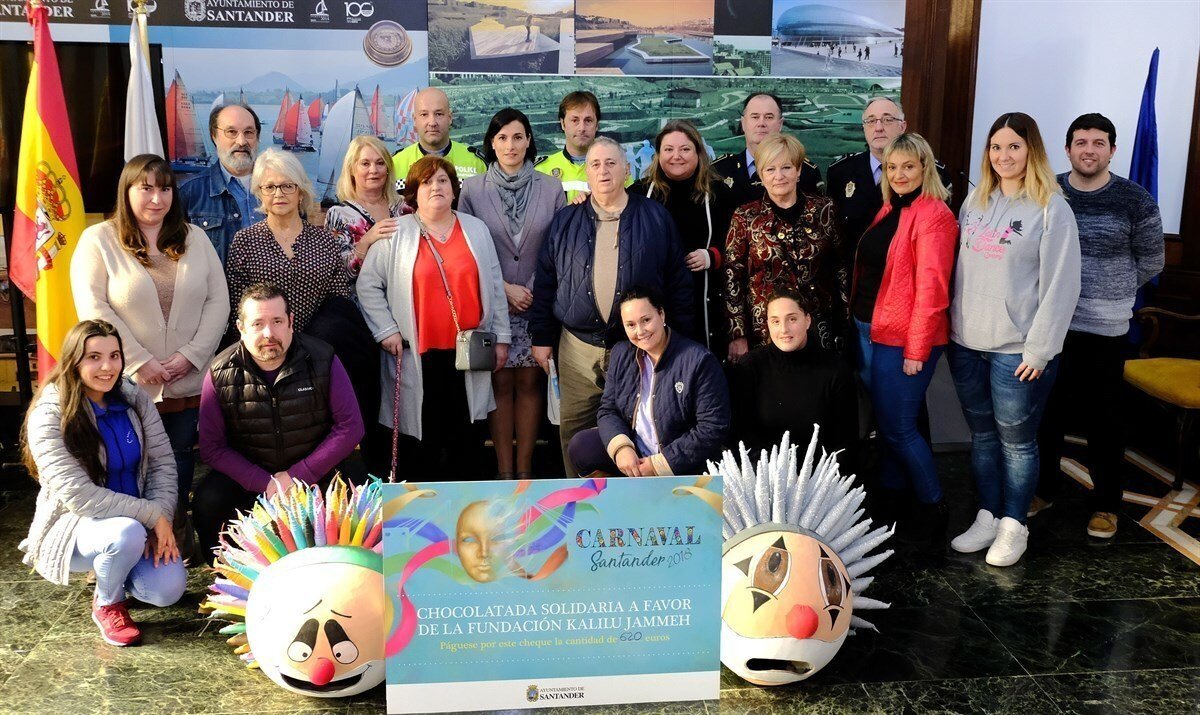La alcaldesa de Santander, Gema Igual, ha hecho entrega al policía local Fernando Villoslada y al agente de movilidad Javier Galiano, cooperantes en la Fundación 'Kalilu Jammeh', de la recaudación de la chocolatada solidaria con la que se cerró la programación del Carnaval santanderino, el pasado domingo 11 de febrero, en la plaza Porticada.