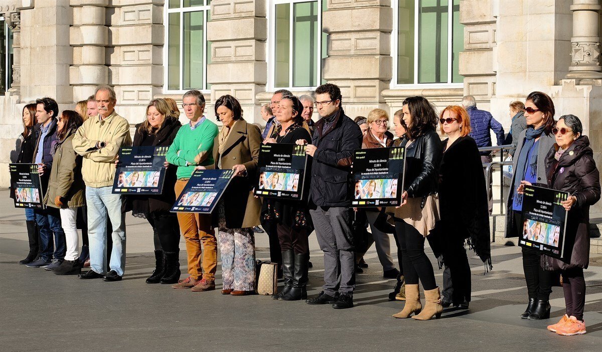 Miembros de la Corporación santanderina, trabajadores municipales y vecinos han guardado hoy un minuto de silencio en la plaza del Ayuntamiento en recuerdo de la mujer asesinada el pasado 19 de enero en Los Realejos (Santa Cruz de Tenerife), la primera víctima mortal de la violencia machista de este año.