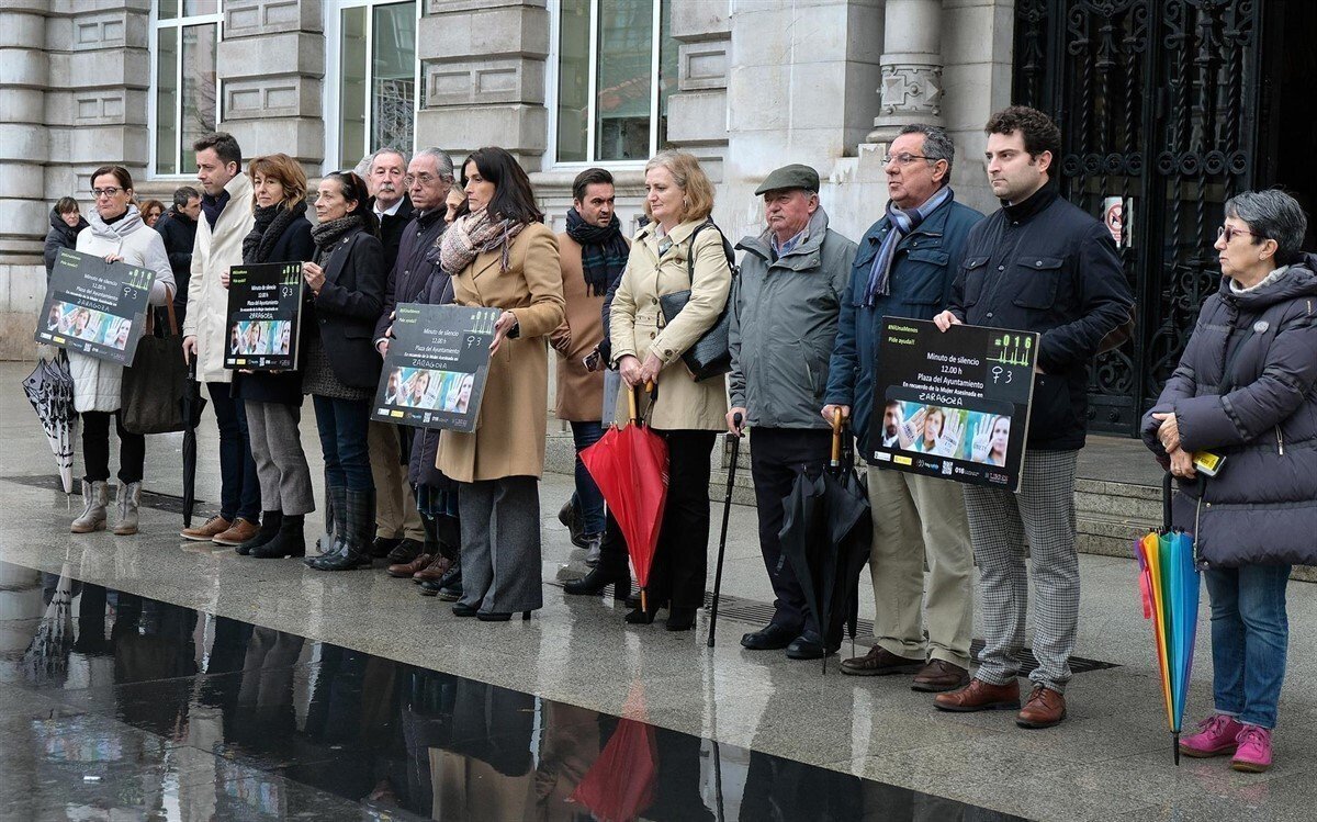 Miembros de la Corporación santanderina, trabajadores y ciudadanos se han concentrado este martes en la plaza del Ayuntamiento para mostrar su repulsa por el último asesinato machista, ocurrido en Zaragoza.