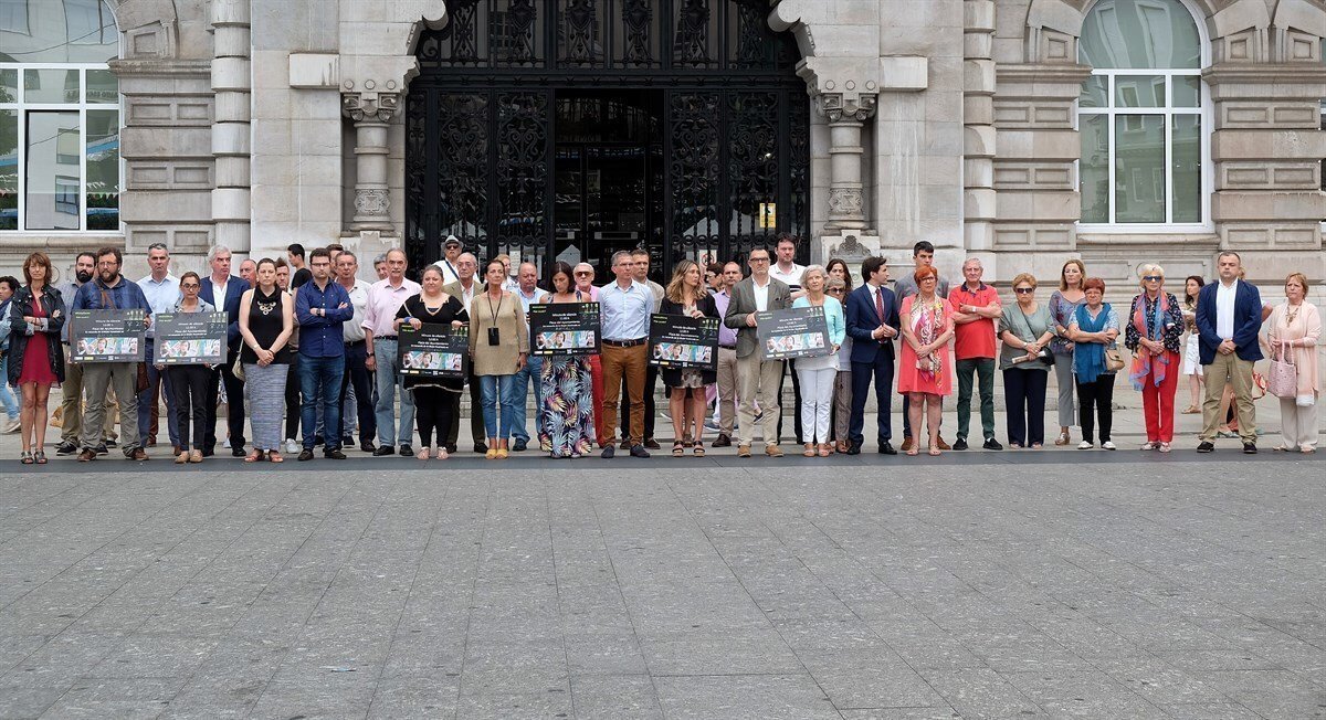 Miembros de la Corporación municipal, trabajadores y ciudadanos se han concentrado este jueves en la plaza del Ayuntamiento de Santander para mostrar su repulsa por el asesinato de una mujer en Astorga (León) y reafirmar su condena y rechazo a la violencia machista.