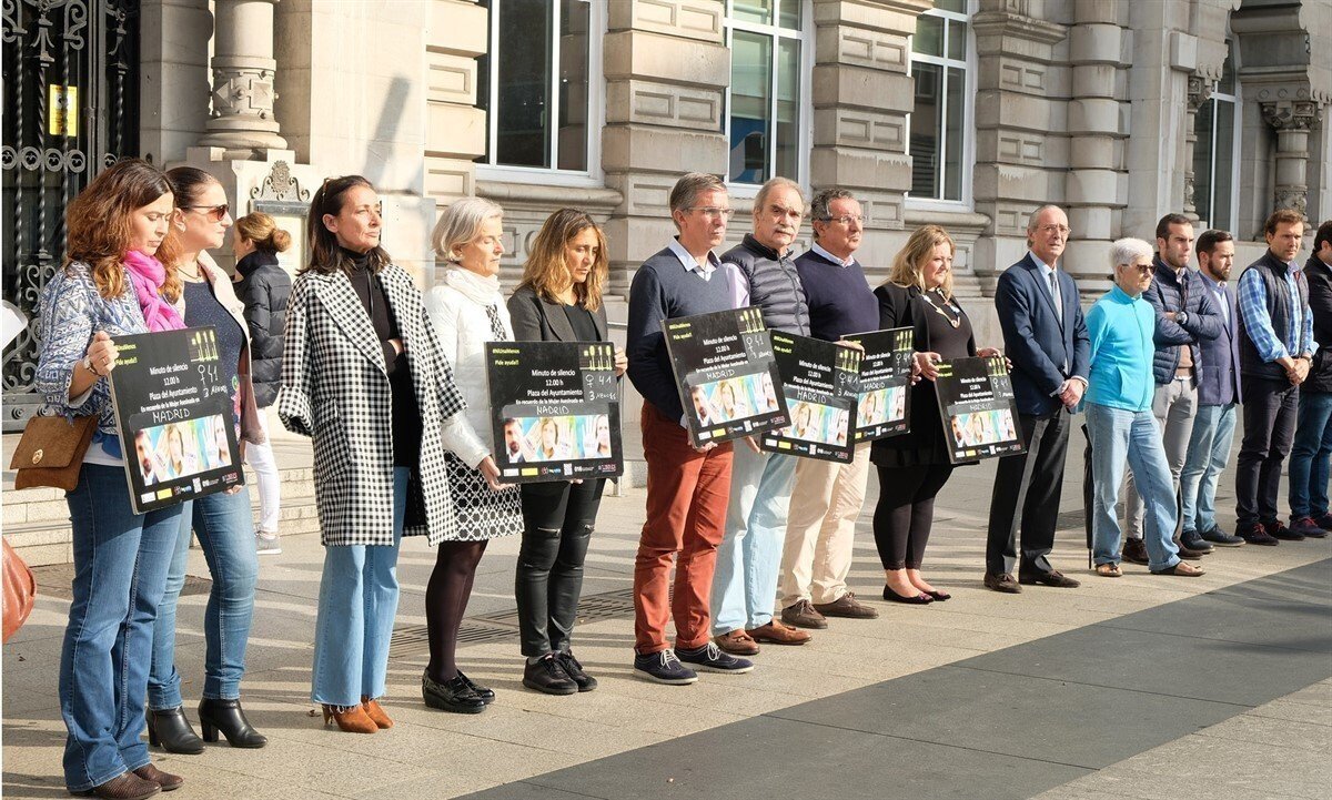 Miembros de la Corporación santanderina, trabajadores municipales y vecinos se han concentrado este mediodía en la plaza del Ayuntamiento para recordar a la mujer asesinada en Madrid el pasado 11 de octubre.