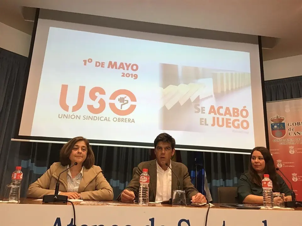 El secretario general de USO, Joaquín Pérez, ha presentado este miércoles en Santander, junto con la secretaria general de USO-Cantabria, Mercedes Martínez, el acto confederal del 1º de Mayo. Según ha explicado Pérez, el lema elegido pretende evidenciar que "en este país llevamos años jugando con la economía, con el empleo, con el sistema de protección social y con el sindicalismo".