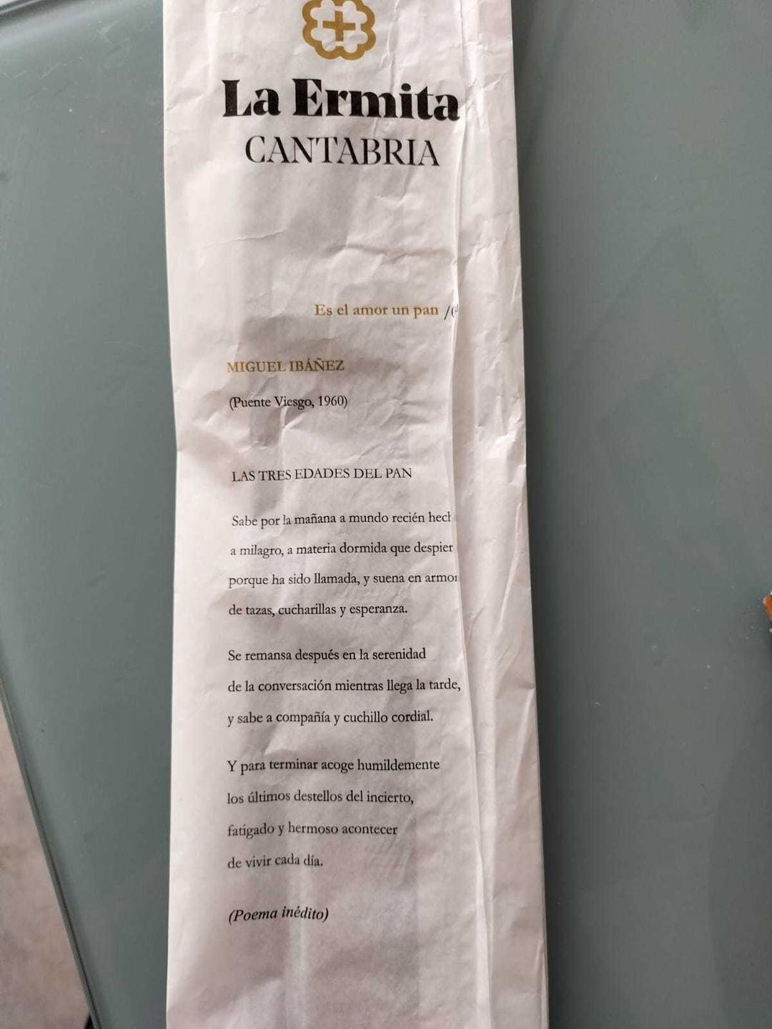“¿Algo así como los azucarillos del café en los que hay poemas?”, le preguntamos. “Exacto”, nos detalla. Y es que empapar de cultura nuestro día a día no nos cuesta nada, una simple bolsa de la barra del pan. Una idea, nos recalca, que no hubiese sido posible sin la ayuda de Amparo Salmón, la propietaria de La Ermita, la empresa cántabra que también se dedica al mundo del pan, entre otras muchas variedades de productos.