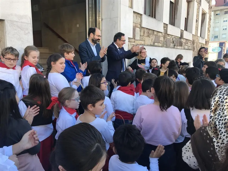 Decenas de niños y niñas del colegio Menéndez Pelayo se han congregado hoy frente al Ayuntamiento de Torrelavega y se han convertido, por un momento, en verdaderos marceros.