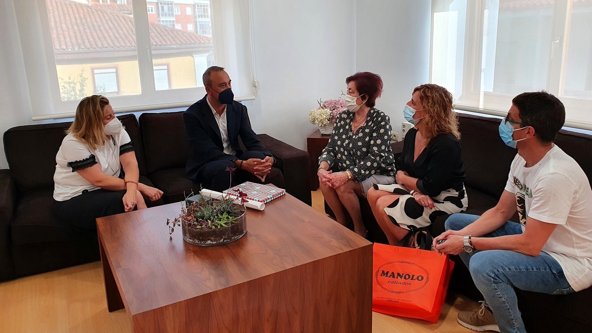 El alcalde de Torrelavega, Javier López Estrada, y la concejala de Comercio, Cristina García Viñas, se han reunido con la familia Andrés Burguera, propietarios de Calzados Manolo, para transmitirles la felicitación de toda la Corporación por la mención honorífica en los Premios al Pequeño Comercio 2020 que han recibido recientemente dentro de los Premios Nacional de Comercio.