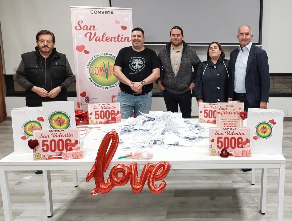 La Asociación de Comerciantes y Empresarios de Torrelavega (COMVEGA)celebró ayer el sorteo de los premios de su campaña de promoción comercial de San Valentín, consistentes en cuatro vales de compra de 500 euros cada uno.