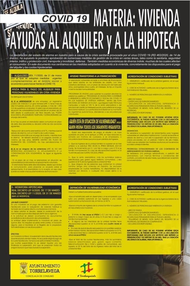 El Ayuntamiento de Torrelavega, a través de la Concejalía de Consumo, ha editado un folleto-resumen que recopila todas las medidas adoptadas por el Gobierno de España en materia de vivienda, concretamente las ayudas dispuestas para el pago del alquiler y las cuotas hipotecarias.
