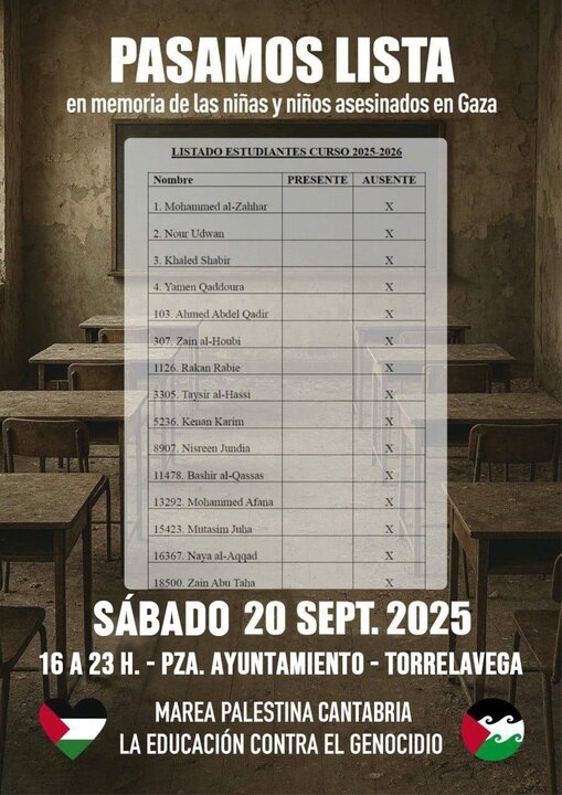 La comunidad educativa de Cantabria se concentrará en la plaza del Ayuntamiento de Torrelavega en el acto 'Pasamos lista', una acción de denuncia impulsada desde la campaña estatal Marea Palestina: la Educación contra el Genocidio.