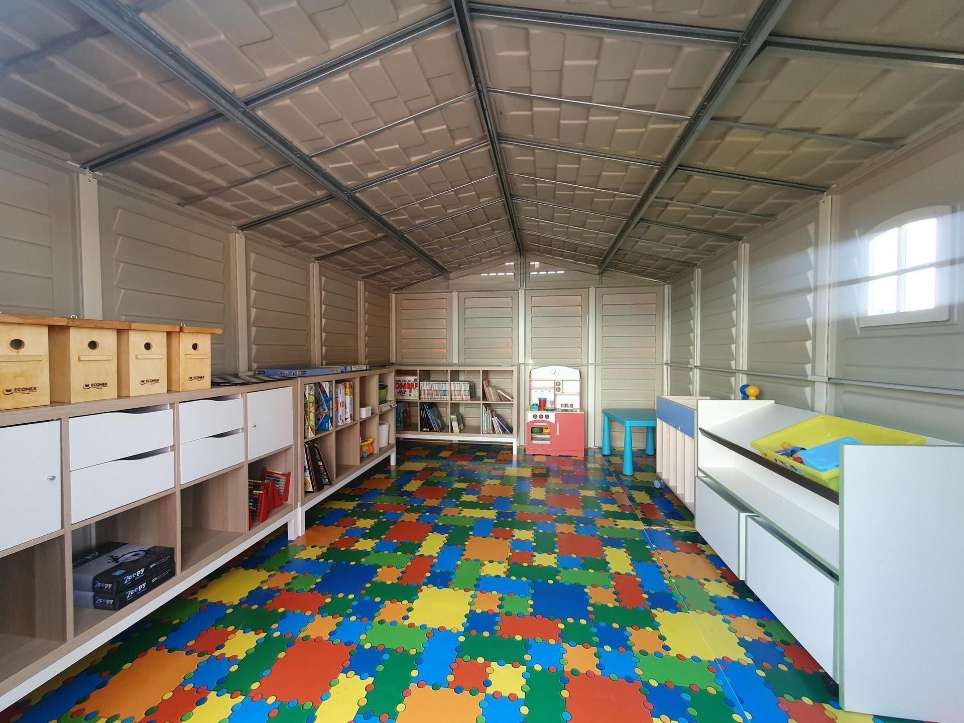 Doce meses después, la biblioteca ha regresado a su espacio en el centro educativo y la caseta se ha convertido en una "casita de juegos".