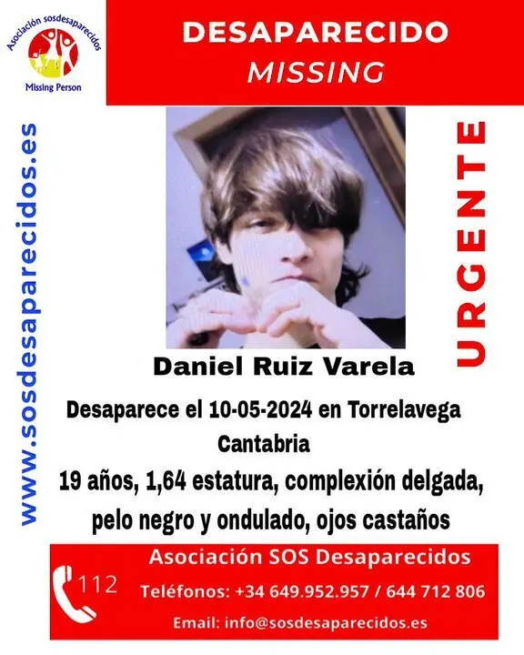 El joven que se busca es Daniel Ruiz Varela, que desapareció el pasado 10 de mayo, viernes, en Torrelavega. Tiene 1,64 metros de estatura y es de complexión delgada, con pelo negro y ondulado y ojos castaños, según SOS Desparecido, que ha difundido un cartel con la alerta urgente por desaparición de este chico.