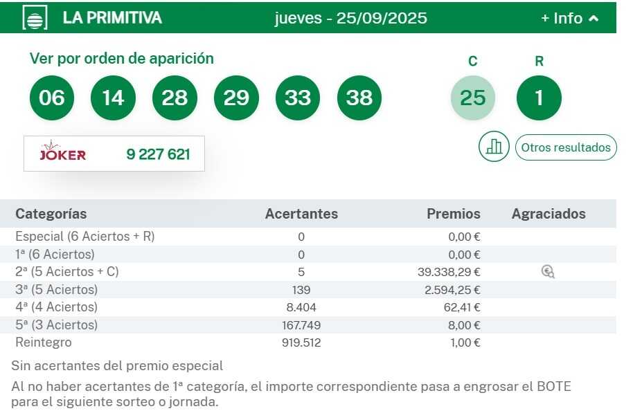 En el sorteo de La Primitiva del jueves no existen boletos acertantes de Categoría Especial ni de Primera Categoría, por tanto, el fondo destinado a ambas Categorías se ofrecerá como bote en el próximo sorteo de La Primitiva, donde un único acertante de Primera Categoría con Categoría Especial podría ganar 7.500.000,00 euros.