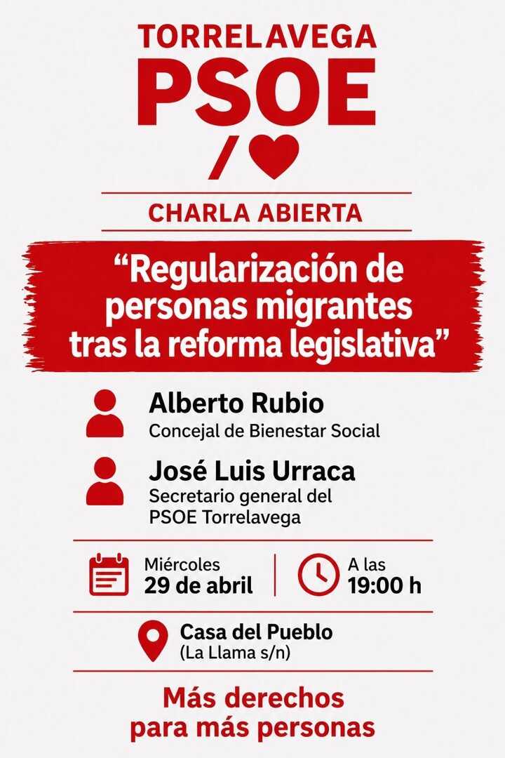 El PSOE de Torrelavega ofrece este miércoles 29, a las 19.00 horas, la charla abierta a toda la población 'Regularización de personas migrantes tras la reforma legislativa', con el objetivo de informar, analizar y debatir sobre los recientes cambios normativos y su impacto.