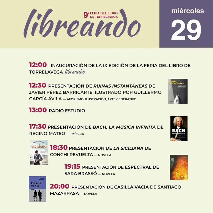 La programación arrancará a las 12.30 horas con la presentación de 'Ruinas instantáneas' de Javier Pérez Barricarte. Por la tarde se presentará 'Bach. La música infinita', de Regino Mateo (17.30); 'La siciliana' de Conchi Revuelta (18.30); 'Espectral' de Sara Brassó (19.15); y 'Casilla vacía' de Santiago Mazarrasa (20.00).