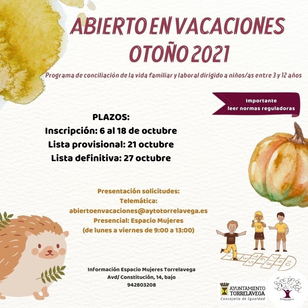 El Ayuntamiento de Torrelavega abrirá desde este miércoles 6 al lunes 18 de octubre el plazo de inscripción al programa de conciliación de la vida familiar y laboral 'Abierto en Vacaciones: Otoño 2021', que se desarrollará del 2 al 5 de noviembre, de martes a viernes.