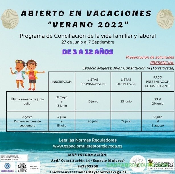 El Ayuntamiento de Torrelavega ha abierto el plazo de inscripción para participar en el programa de conciliación familiar y laboral 'Abierto en Vacaciones. Verano 2022', dirigido a niños de entre 3 y 12 años y que se desarrollará desde el 27 de junio hasta el 7 de septiembre, de lunes a viernes, exceptuando días festivos.