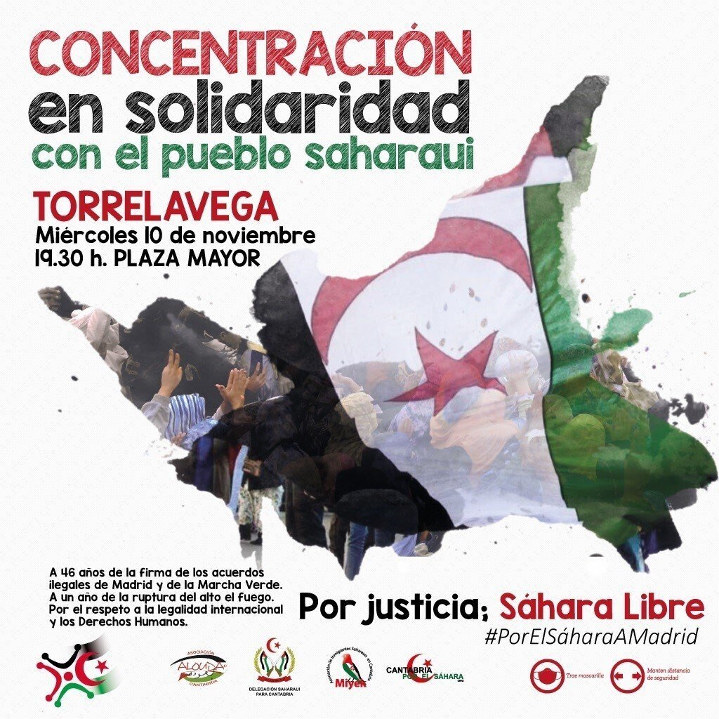 Varios colectivos han convocado para este miércoles, 10 de noviembre, una concentración en Torrelavega en solidaridad con el pueblo saharaui, como acción previa a la manifestación estatal que se desarrollará en Madrid el sábado 13.