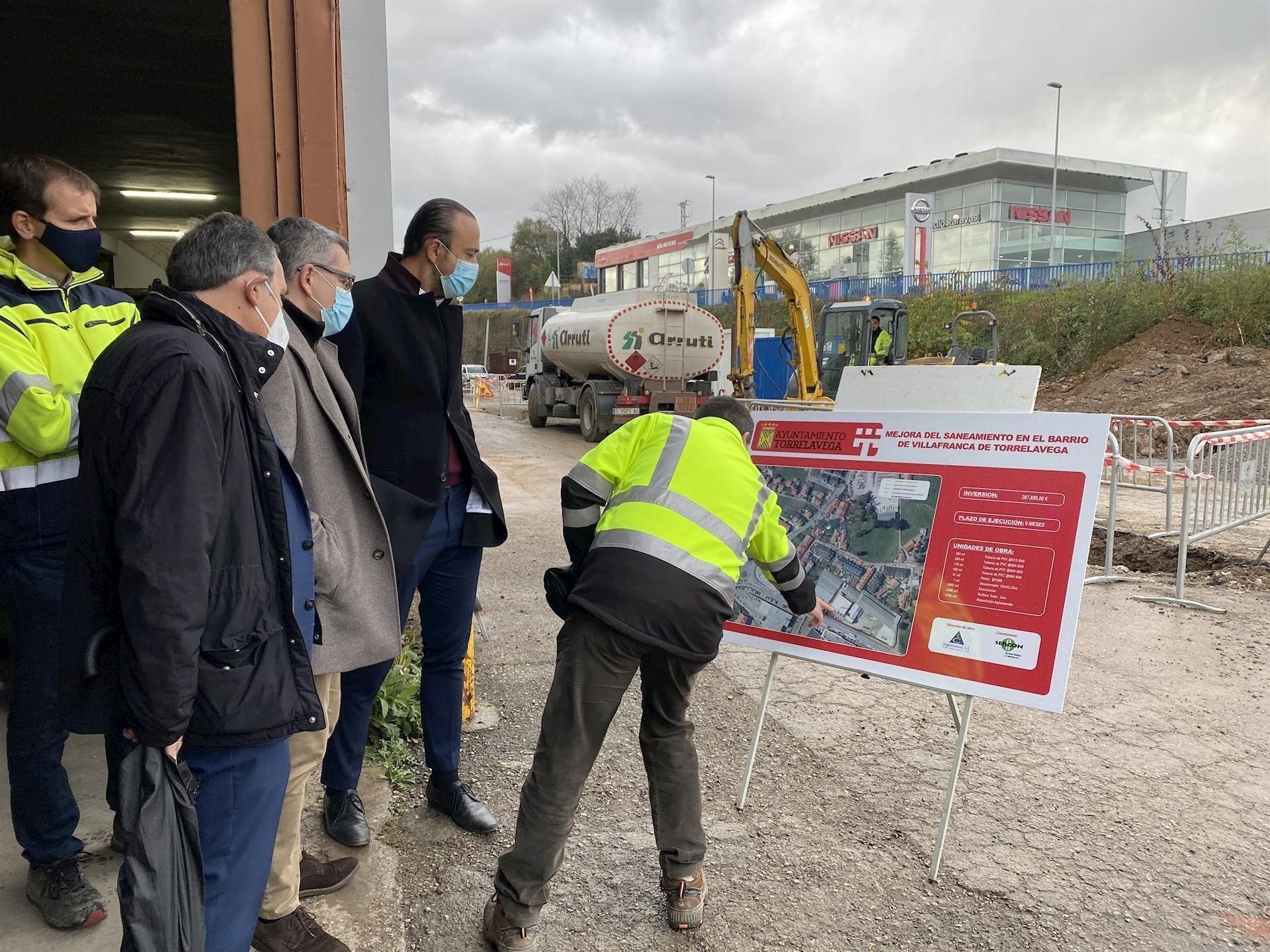 El alcalde, Javier López Estrada, y los concejales de Obras y Aguas Torrelavega, José Manuel Cruz Viadero, han visitado este miércoles las obras y han destacado el "compromiso" del equipo de Gobierno (PRC-PSOE) por dar solución a los problemas de saneamiento de los barrios y pueblos del municipio.