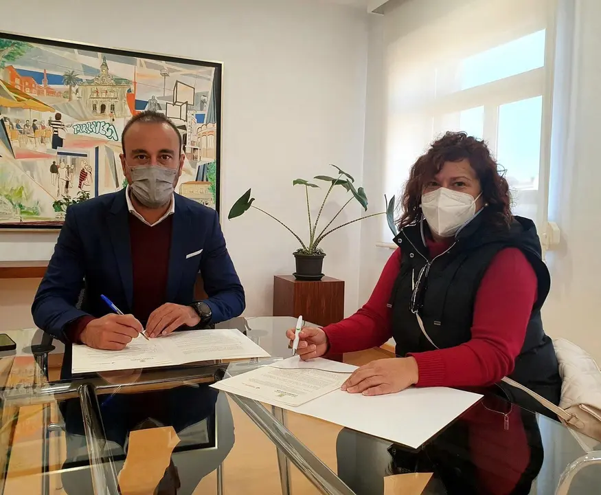 El alcalde, Javier López Estrada, y la presidenta de la Asociación Cántabra de Parkinson, Nuria Gómez Boo, han firmado el convenio de colaboración por el que el Ayuntamiento concede a esta asociación una subvención de 4.000 euros para realizar proyectos de ayuda a pacientes y familiares afectados por esta enfermedad durante 2021.