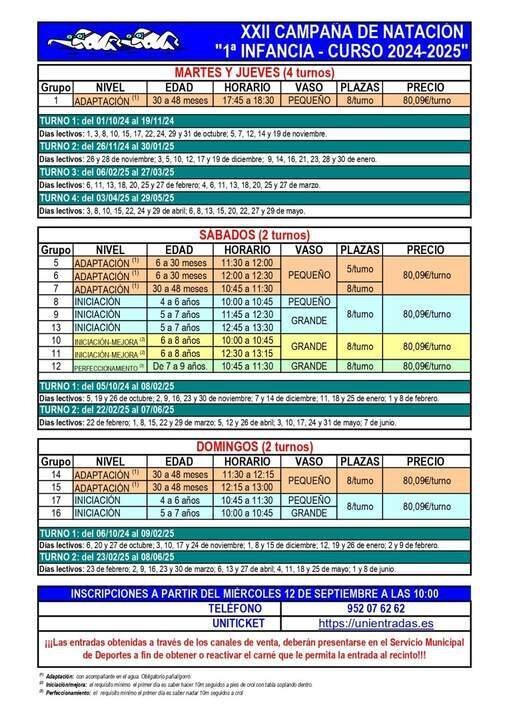 El periodo de inscripción comenzará el 12 de septiembre a las 10.00 horas y podrá realizarse en el teléfono 952 07 62 62 y a través de la plataforma Uniticket https://unientradas.es. Las entradas obtenidas a través de los canales de venta deberán presentarse en el Servicio Municipal de Deportes (pabellón Vicente Trueba, de 9.00 a 14.00 horas) para obtener o reactivar el carnet.